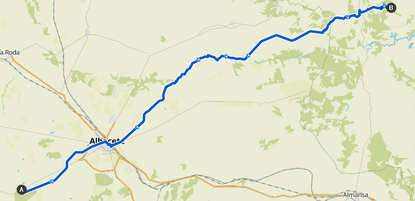 Heute morgen mal ohne Frühstück um 7:45 Uhr in See gestochen…Albacete ist nach 10 km, es ist frisch…durch die sonntäglich ausgestorbene Stadt geht es zügig und es geht auf 20 km “Bikerhighway” ins Dorf am Fluss, wo ich erstmal mein Müsli esse..dann geht es weiter schön am Fluss entlang, einsame Straßen und viele Feldwege durch die fantastischen Weiten von Castillo y La Mancha…wen wunderts dass Don Quijote auch damals schon seinen Esel hier durchgetrieben hat..