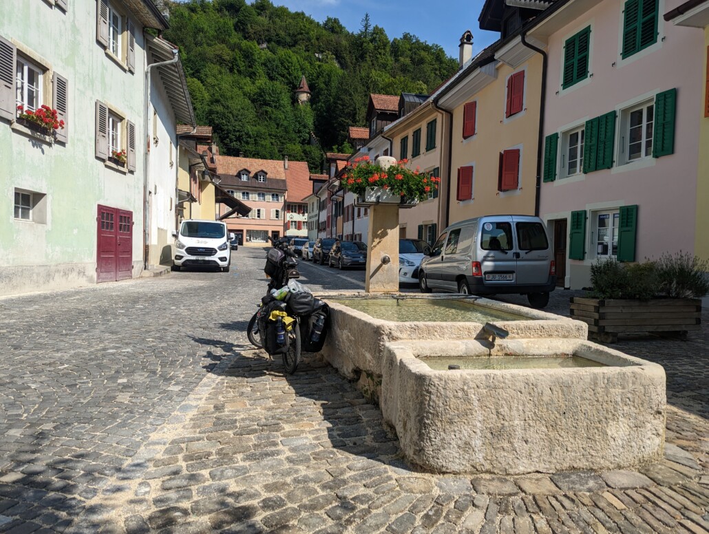 Nach einem guten Abendessen bei Sonnenuntergang hat es in der Nacht wieder zu regnen angefangen, morgens ist es wieder trocken, aber zum frühstücken ist es mir im Indianerland noch zu kühl..es fängt nochmal leicht zu regnen an, in Saint Ursanne, ein schönes picturesques Städtchen, kaufe ich im COOP ein, zapfe Wasser am Stadtbrunnen und rechtzeitig für den langen Anstieg zeigt sich die Sonne von ihrer schönsten Seite..