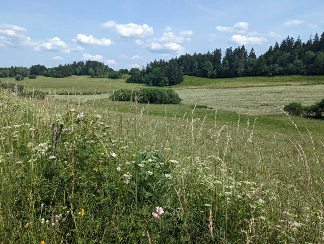 Heute ist die zweite Bergetappe…um acht geht’s auf den Sattel…durchs Jura durch Wald und Wiesen, das frische Heu duftet, sehr schön hier durchzucruisen..das ist die Schmerzen wert..es geht rauf und runter auf 1000 m.ü.M.