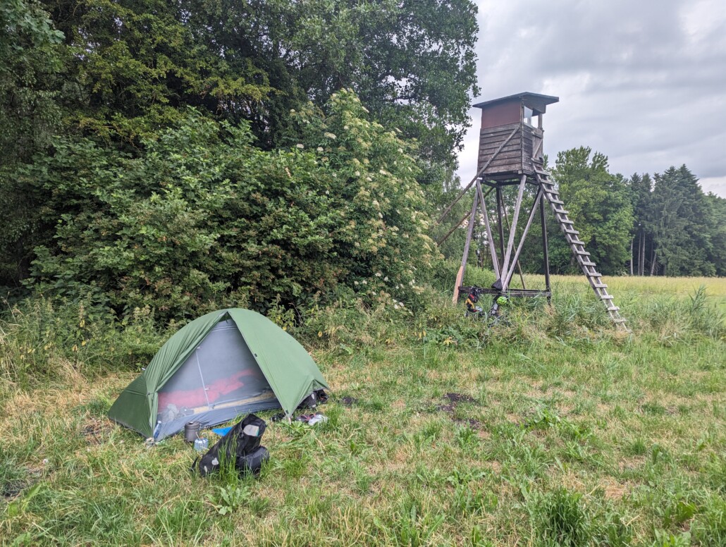 In Bad Wörishofen bei netten Wirtsleuten noch einen Cappuccino und einen sensationellen Marillenstrudel gegessen und um 7 Uhr stelle ich mein Zelt am Waldrand neben dem Jägerstand auf vor Landsberg am Lech auf.. Heute waren es, gestärkt von den Kässpätzle 125 km und 1300 hm Anstieg..