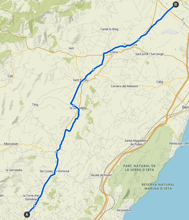 Heute ging’s erstmal ein Stück in den Bergen..gute Radwege..aber überall Autobahnen..Lärm..irgrndwie ist es hier George Orwell Land…dann 14 km bergab nach Torreblanco und dann ein super Linseneintopf und Empanada de Bacalau in Santa Magdalena..dann nochmal 50 km bis Alcanar zum ersten Campingplatz auf der Tour.. Wäsche waschen und vor allem meinen Stromspeicher laden..schöner Camping direkt am Meer..